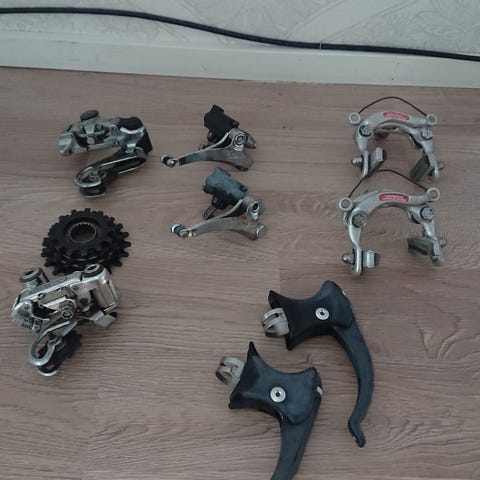 Etujarrulänget sveitsilaiset Weinmann 605. Takalänget Dia Compe. Kunto hyvä, ruuvit eivät ole jumissa. Jarrupalat todennäköisesti kovettuneet.