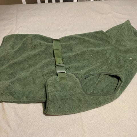 Ainoastaan sovitettu omalle ja todettu että on pieni meille. Ihanan pehmonen ja varmasti mukava koiran päällä kun ei ole kankea niin helppo liikkua se yllä. Helppo pukea tarra kiinnitys. Kaula osan saa säädettyä sopivaksi.