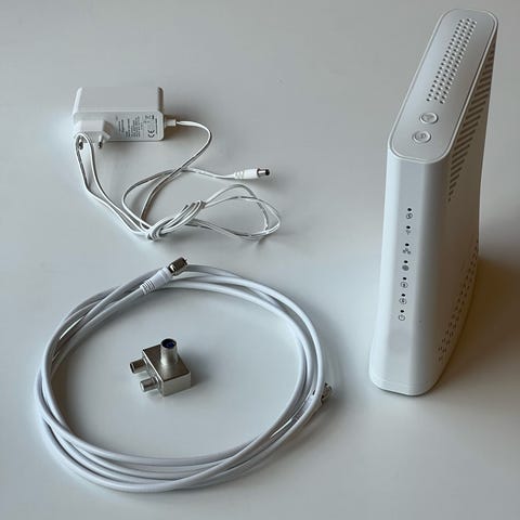 Mukana tulee virtajohto, antennijohto, antennijakaja ja ethernet johto ei laatikkoa.