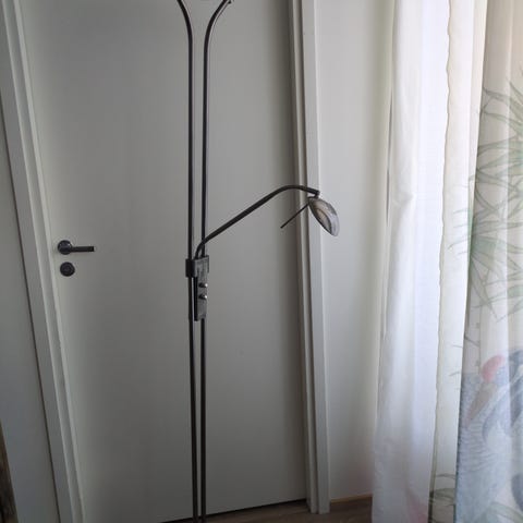 Myydään jalkalamppu jossa ”kultaiset” koristukset ja puuta. Ollut käytössä ja toimii hyvin. Pinnassa kuitenkin naarmuja ja kulumaa. Näkyy kuvissa.