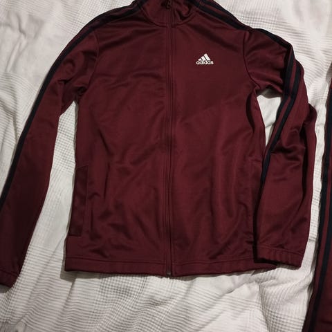 Adidas verkkariasu miehille koossa L. Kaksiosainen asu, johon kuuluu vetoketjullinen takki ja pitkät housut. Takki käyttämätön, housut vähän pidetty. Väri khaki/oliivinvihreä, tummat yksityiskohdat kauluksessa ja hihoissa sekä lahkeissa. Takissa korkea kaulus ja täyspitkä vetoketju. Housuissa joustava vyötärö kiristysnyörillä ja lahkeissa vetoketjut. Sopii miehille vapaa-aikaan ja kevyeen liikuntaan.