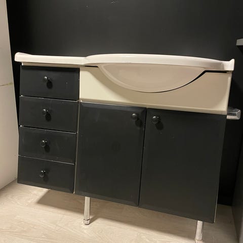 Hyväkuntoinen allaskaappi tarjolla. Rungossa ja kaapissa ei moitittavaa. Allastaso tulee kaupassa mukana ja siinä on muutama naarmu ja pinta (Evermite) rikki parista kohtaa peilin pudottua tason päälle. Allastasolle laskenkin arvoksi 0 euroa. Rungon takalevystä löytyy valmis isohko aukko putkia varten.