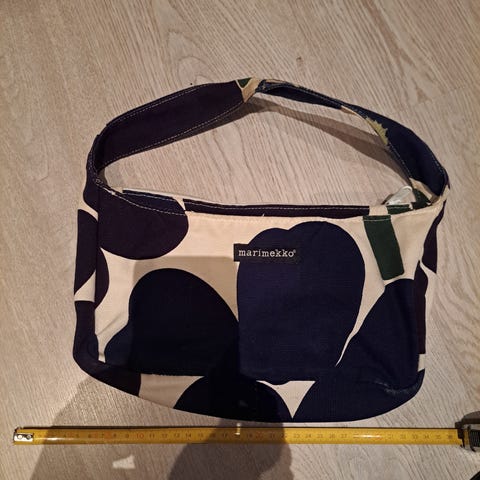 Vaaleansininen marimekon käsilaukku. On vähän kulumaa ja paikoiten pientä värjäymää (kuten kuvassa 5), mutta yleiskunto hyvä.