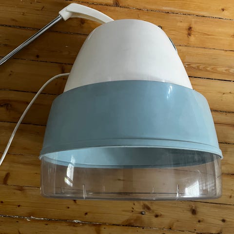 Retro jalallinen hiustenkuivaaja. Pyörät alla. Kuvun halkaisija 30 cm. Säädettävä jalkaosa. Väri harmaa/valkoinen. Toimiva ja tukeva. Valmistaja Favorit.