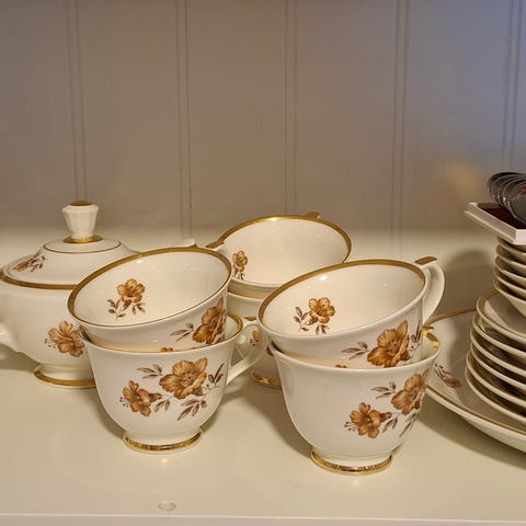 Myydään vähän käytetty kahvi astiasto Fyrklövern-yhtiön Christineholm-malliston "Sininen Kartano" -astioita.