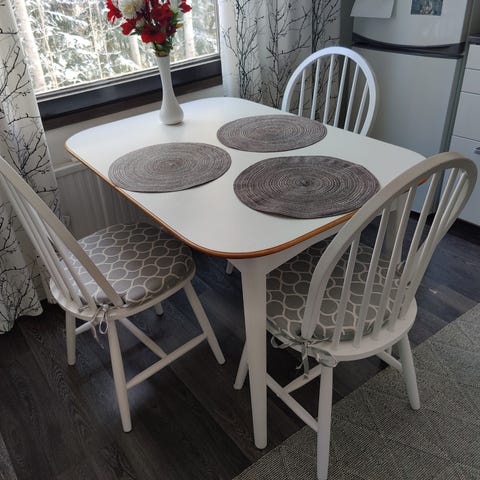 Ostetaan neljän hengen ruokapöytä, suorakaiteen muotoinen, puupinnalla. Ei pyökkiä. Koko noin 160 x 90.
