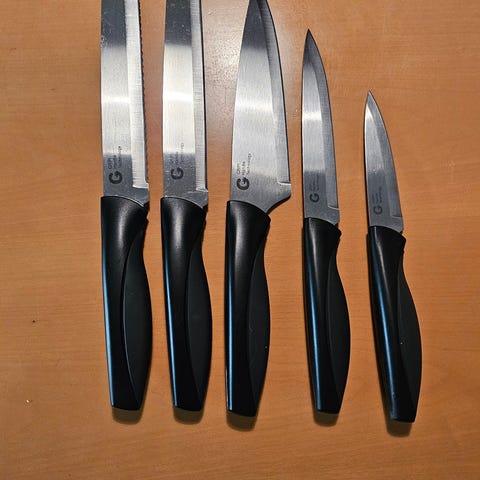 Richardson Sheffield merkkiset ruostumattomasta teräksestä valmistetut veitset: kuorimaveitsi 20cm ja yleisveitsi 23,5cm, joissa pehmeä kahva. Bambusta valmistetun leikkuulaudan mitat: 51cm x 13,5cm. Käyttämätön setti.