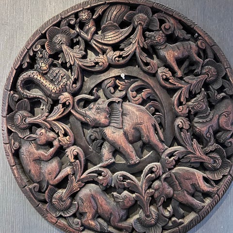 Myydään näyttävä, käsin kaiverrettu Thaimaasta tuotu puinen seinätaulu, halkaisija noin 60 cm.