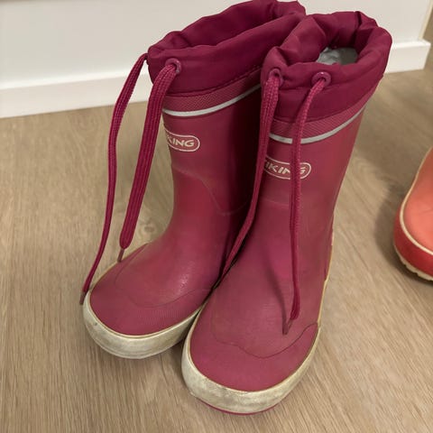 Liilat Viking lasten kumisaappaat, koko 25. Väri vaaleanpunainen, pohjassa kontrastivärinen raita ja karkea kumipohja. Yhden lapsen käyttämät.