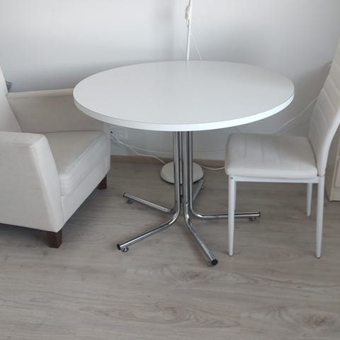 Pöytä neljälle. Halkaisija 105 cm, korkeus n. 75 cm.