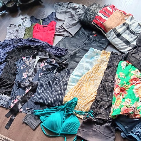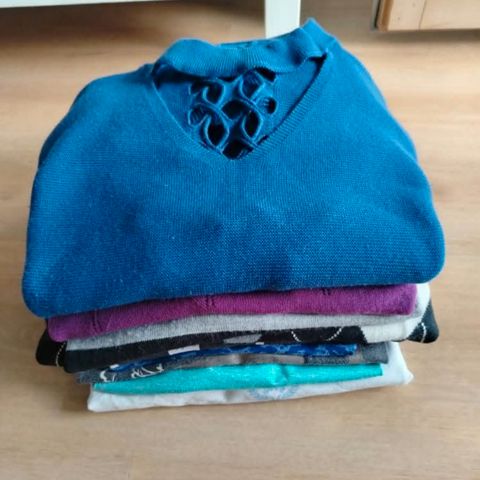 S-M kokoiselle juhlava neuletakki, sininen pehmeä neuletakki, Naketanon rennot housut, pitkä collegepusero, Mc Kinleyn kevytuntuvatakki, käyttämätön shaali ja musta ohut paita.