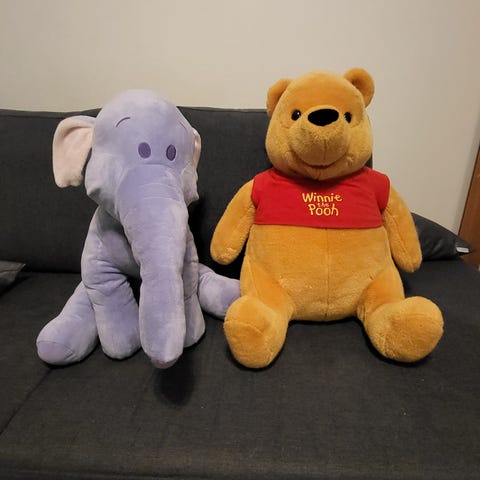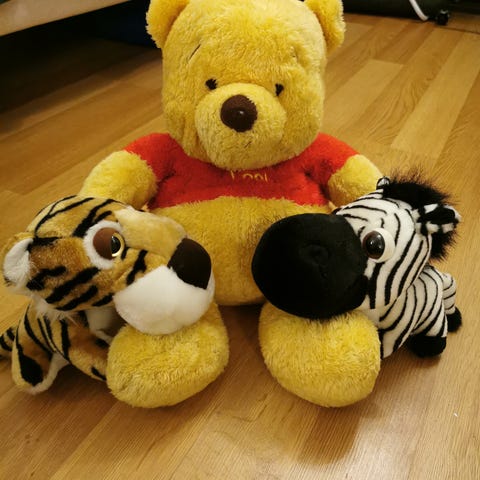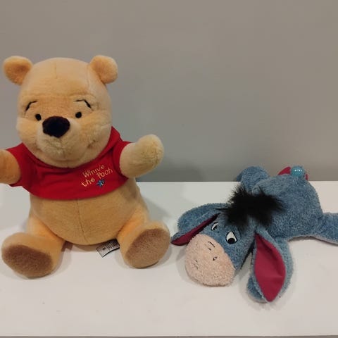 Nalle Puh pehmolelut, hahmoina Ihaa ja Tiikeri. Ihaan korkeus 66vm ja Tikru 42cm. Koiratalous, mutta säilytetty eri tilassa. Yhteensä molemmat 5€ noudettuna.