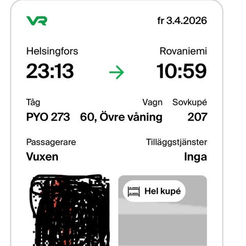 Junalippu Rovaniemi-Helsinki Pasila La 7.3.2026 makuuhytti koira 2 aikuista auto