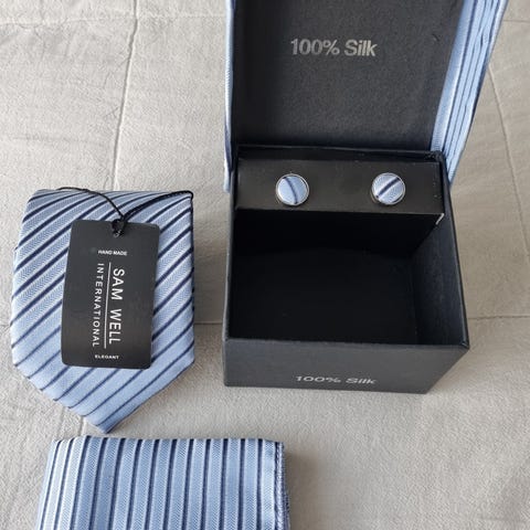Käyttämätön setti johon kuuluu samaa sävyä olevat solmio, kalvosinnapit ja taskuliina.