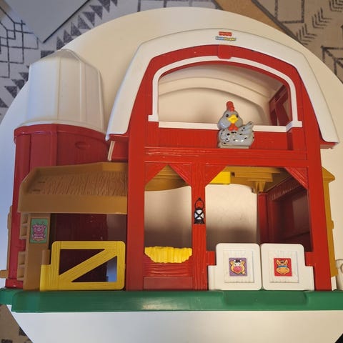 Fisher-Price Little People maatilaleikkisetti. Mukana tulee Little People -hahmo sekä useita maatilan eläinhahmoja, hevonen, lehmä, possu, kana ja eläinten ruokaa. Äänet toimivat. Savuton ja eläimetön koti.