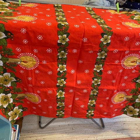 Vaalean ruskealla pohjalla sydämiä ja tonttutyttöjä ja -poikia sekä kukkia. Puuvillaa. Kunnossa ei muuta moitittavaa kuin pieni vaaleampi kohta joka näkyy myyntikuvassa keskellä oikealla.