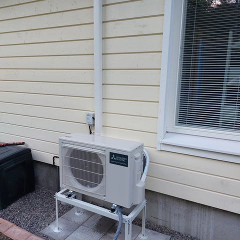 Mitsubishin ja boschin ilmalämpöpumput ylimääräisenä kaupan, kaksi ulkopäätä ja kolme sisäpäätä. Mitsubishiin mukaan teline.