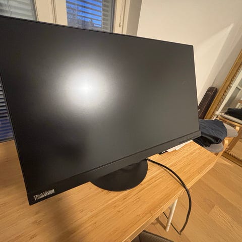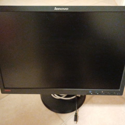 Lenovo 22" näyttö. Näytössä on tasainen ruutu ja se on tarkoitettu tietokoneen ulkoiseksi näytöksi. Mukana näkyvät kaapelit liittämistä varten. Kunto hyvä.