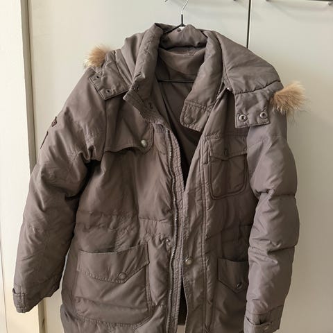 Valkoinen kevyttoppatakki. Koko s, merkintää ei ole.