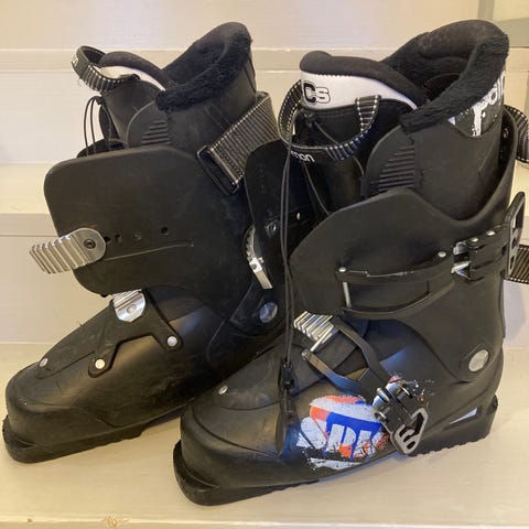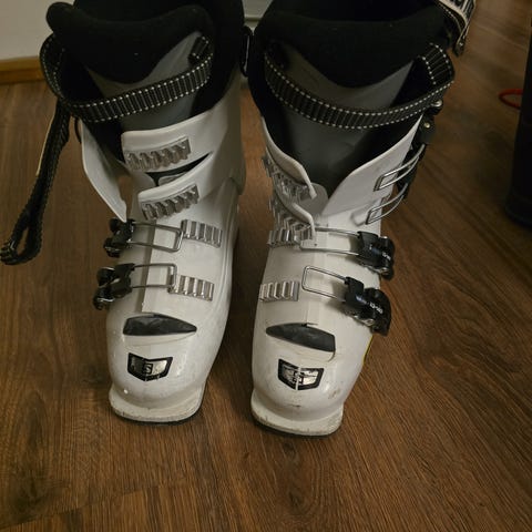 Vähällä käytöllä olleet Salomon 60 T laskettelumonot, koko 23–23,5 MP. Väri valkoinen mustin ja keltaisin yksityiskohdin. Monossa neljä säädettävää solkea ja leveä varrensolki istuvuuden säätöön. Sopivat lasketteluun esimerkiksi nuorille tai pienijalkaisille aikuisille, joille 23–23,5 kokoluokan mono on sopiva.