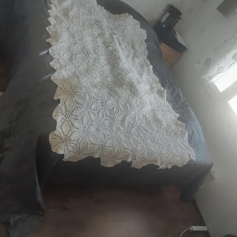 Luonnonvalkoinen virkattu päiväpeitto, puhdas, ei tahroja.