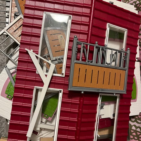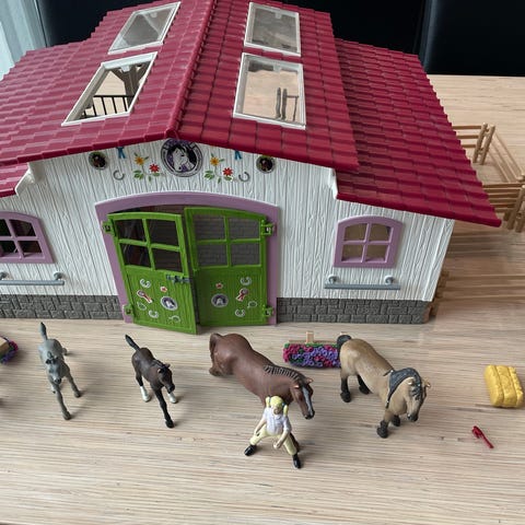 Schleich hevostalli ja useampi hevonen ja muita tarvikkeita. Tallissa on useita karsinoita, avattavat ovet ja irrotettava katos.