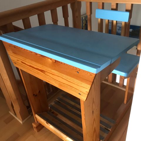 Kuvien mukainen pulpetti. Kannen alla oleva laatikko hieman vaurioitunut mutta tuskinpa vaikuttaa käyttöön.