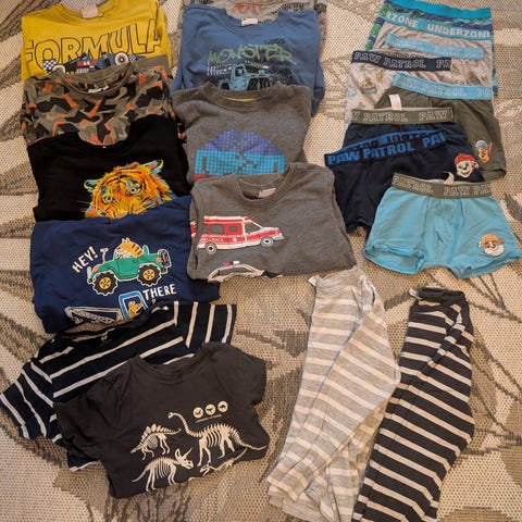 Iso vaatepaketti siistejä vaatteita. Collegepaita, -takki, -huppari ja -housut, farkkuja, verkkarit, pitkiä kalsareita, shortseja, T-paita, yöpukuja, uimashortsit ja kauluspaita.