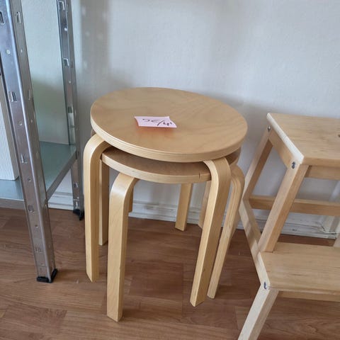 Käytetty kunto, yhdessä mustassa pieni maalitahra ja lisäksi kaikissa pieniä muita käytönjälkiä. Korkeus 45cm. Tokmannilta ostetut jakkarat.