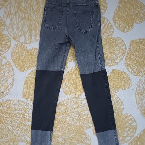 H&M tummanharmaat farkkuleggarit, 140. Hieman varmaan haalistuneet, muita moitteita en keksi.