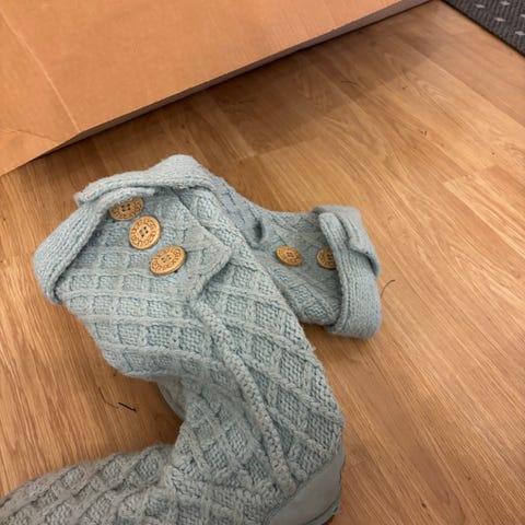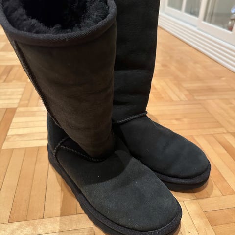 UGG lasten saappaat, koko EU 39, unisex-malli. Varren ulkopinta on musta ja sisäpuolella on vaalea turkisvuori, joka näkyy myös varren yläosassa käännettynä. Saappaissa on kaksi solkikiristystä varren yläosassa ja kumipohja. Sopivat lapsille ja nuorille yleiseen ulkoiluun talven kylmällä säällä. Ostettu Torista ja myyn ne, koska eivät mahtuneet jalkaan. Haku Mellunmäki tai postitus.