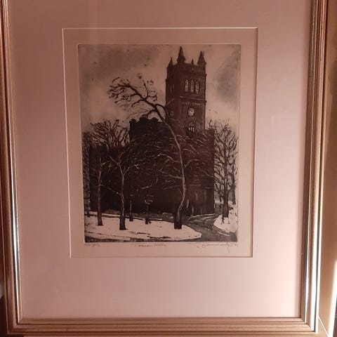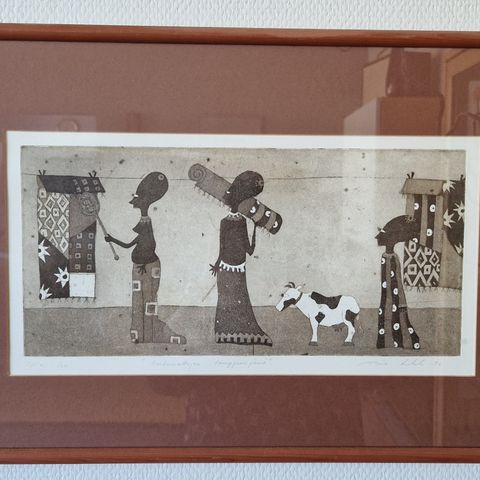 Kehystetty taulu, jossa naisaiheinen grafiikkateos. Taiteilija Kristiina Lohiluoma. Teos on vuodelta 2011.