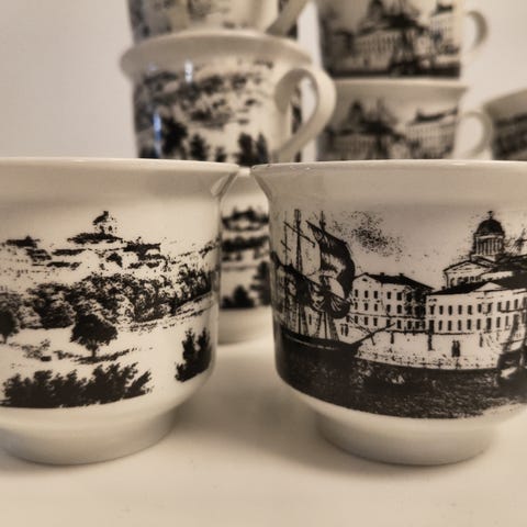Espoo 2001 kahvikupit, tassit ja lautaset