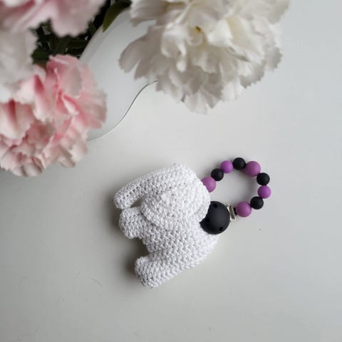 Suloinen käsin virkattu norsu-vaunulelu, joka sopii täydellisesti vauvan vaunuihin tai turvakaukaloon!