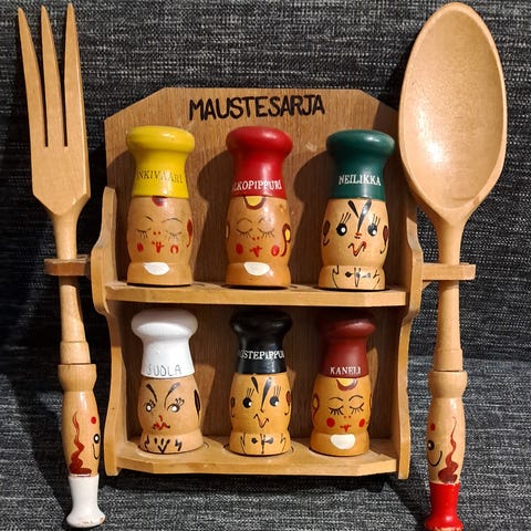 Ilmeisesti 70-lukua. Maustepurkit sinistä lasia, kannu keramiikkaa. Toisen maustepurkin korkissa pieni lohkeama ei haittaa käyttöä. Kannun korkeus 8 cm maustepurkit 5,5 ja 6,5 cm