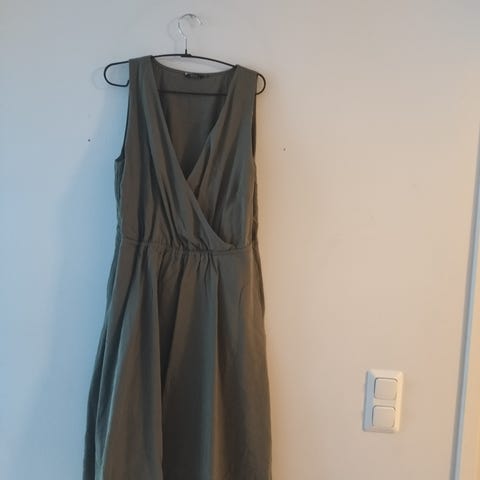 H&M kesämekko naisille, koko L. Vaaleanpunainen pohjaväri, jossa kukkakuviointi punaisen ja beigen sävyissä. Materiaali on viskoosia. Mekossa on pitkät hihat, vyötärölle solmittava vyö ja napitus yläosassa. Sopii arki- ja kesäkäyttöön.