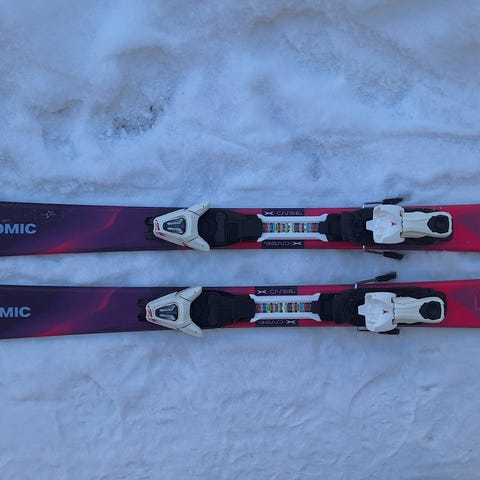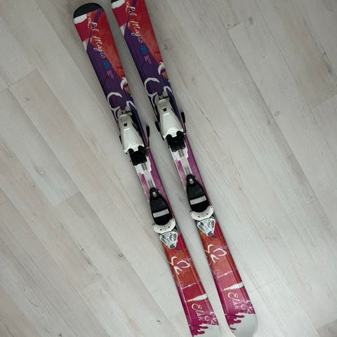 Atomic Elysian 120 laskettelusukset ja sauvat. Suksien pituus on 120 cm ja väritys pääosin valkoinen kuviollisilla yksityiskohdilla. Suksissa on siteet valmiina.
