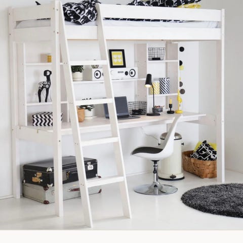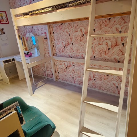 Hyvässä kunnossa oleva lasten parvisänky. Sängyssä hyvän kokoinen pöytä. Pöydän alapuolella kolme säilytys laatikkoa. Kaappi on tilava jossa on kaksi hyllyä sekä tanko vaatteille.