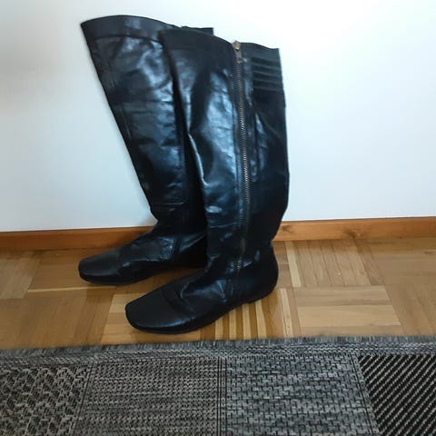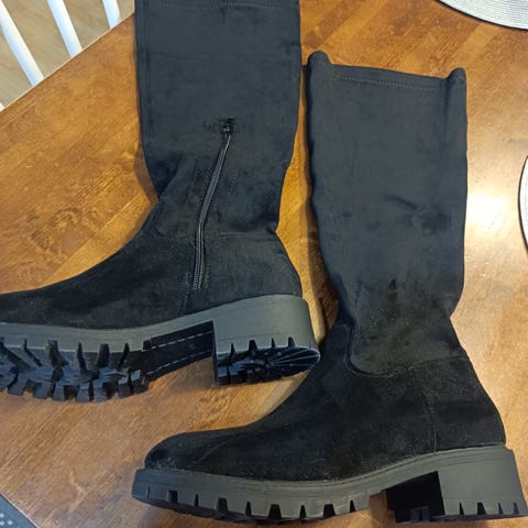 Even&Odd saappaat, koko 41. Väriltään mustat, polven alle ulottuvat nauhalliset saappaat, joissa on paksu, kuvioitu kumipohja. Päällinen nahkaa.