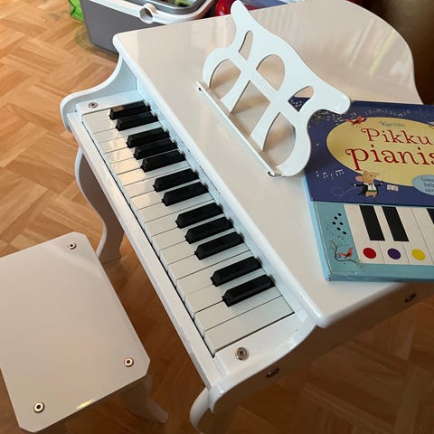 Mukana jakkara. Toimiva ja siisti, sopii hyvin lapsille leikkiin ja musiikin kokeiluun.
