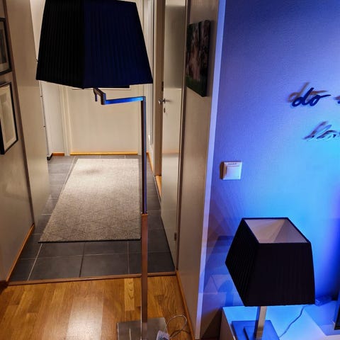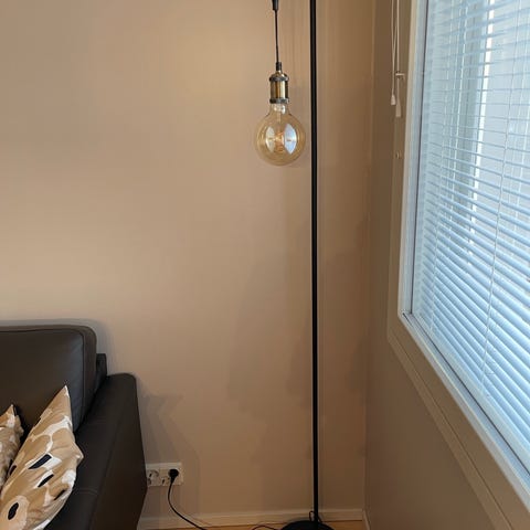Jotexilta ostettu Monroy lattiavalaisin / yöpöytä. Pinnassa muovipleksi ja alla ledit jotka toimivat paristoilla. Valojen kytkin sijaitsee pöydän alla. Pleksissä naarmuja, samoin kulumaa havaittavissa muuallakin, pahimmasta kuva viimeisenä.