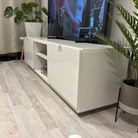 Valkoinen TV-taso. Leveys: 180 cm, korkeus: 40 cm. Erinomaisessa kunnossa, ei naarmuja eikä kolhuja.