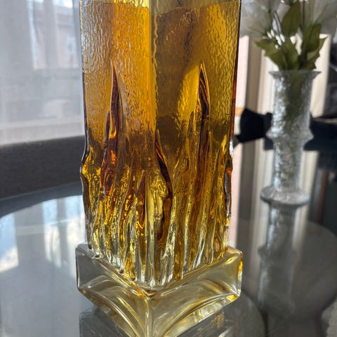 Korkea kirkas lasimaljakko, ehkä ja muuten hyväkuntoinen, mutta alaosassa kalkkijälkiä vedestä.