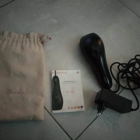 Mandy Skin IPL -karvanpoistolaite kotikäyttöön. Laitteen väri on vaaleanpunainen/ruusukulta ja mukana tulee virtalähde, säilytyslaatikko, sekä musta säilytyspussukka. Soveltuu ihokarvojen poistoon useilta ihoalueilta käyttöohjeiden mukaisesti. Laite toimii verkkovirralla ja sitä käytetään painikkeen kautta, kuten pakkauksen sisäkannessa olevassa ohjeessa kuvataan.