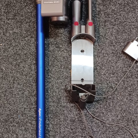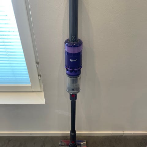 Dyson varsi-imuri, johdoton malli. Mukana pitkä varsi, moottoriosa, laturi, seinäteline, rakosuulake ja pienempi harjasuulake. Soveltuu kodin lattioiden ja pintojen imurointiin. Väri harmaa ja sininen, osassa punaisia yksityiskohtia.