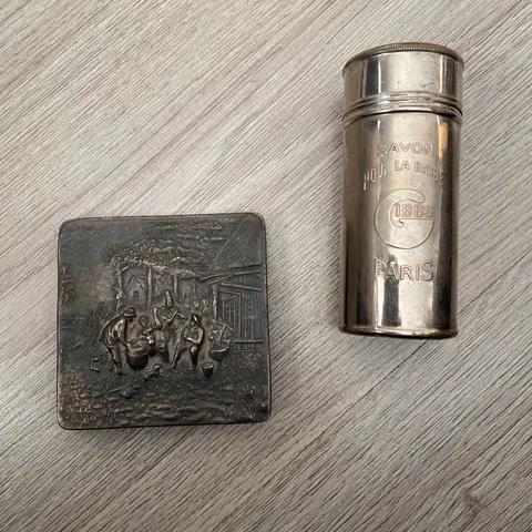 Metallinen pyöreä puuterirasia, jossa kannessa kohokuvioitu maisemakuva talosta, puista ja pellosta. Rasia avautuu saranoilla sekä peili kannen sisäpuolella. Sopii meikin säilytykseen tai koriste-esineeksi. Rasia neljäkymmentä luvulta.
