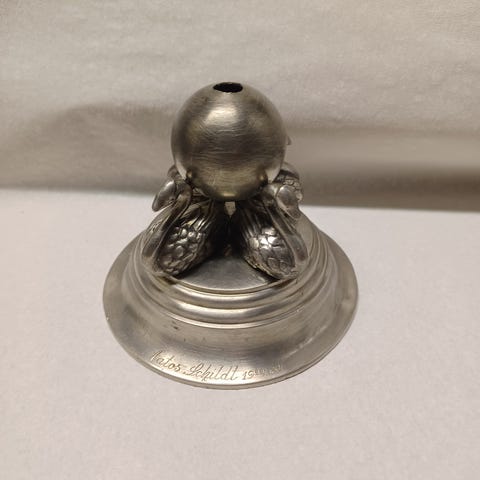 Linna tinan ,koristemaljakko,terä/tina. Pohjassa tekstit. Karl Laineen suunnittelema.