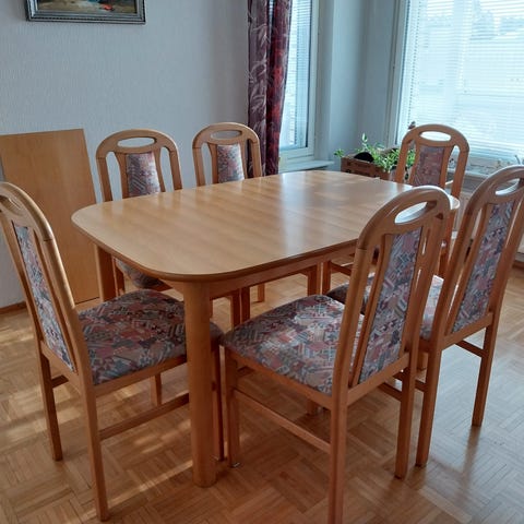 Sotka ruokapöytä tummanruskea / valkoinen + 6 kpl tuoleja tummanruskea / valkoinen. Käytön jälkiä ja kulumista näkyy. Myydään kokonaisuutena.