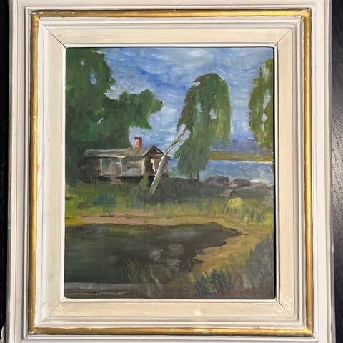 Vaneri pohja? takana teksti; 25 vuotislahja 14.10.1944, kenelle, ei tietoa, kehysten parissa kulmassa halkeama. Koko kehyksineen 58x48 cm.