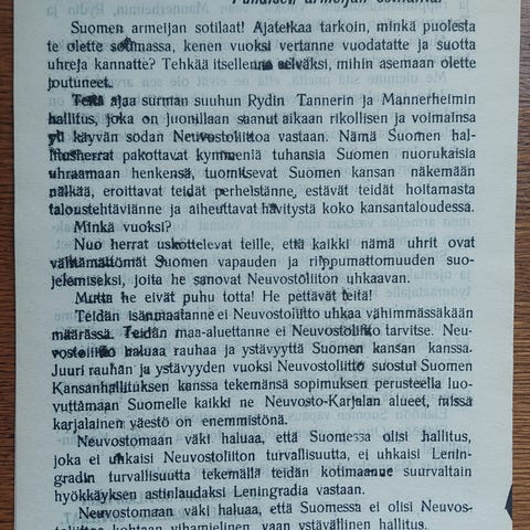 Venäläisten suomalaisille suuntaama lentolehtinen, jolla pyritty murentamaan taistelutahtoa. Ei juurikaan poikkea nykyisestä idän informaatiosta. Tuolla voi "pyyhkäistä" tai säilyttää varoituksena tuleville sukupolville. Koko 18 cmx26 cm. Tuskin aito, mutta painettu vanhalle paperille, eli ei ole eilen kopiokoneella tehtailtu.